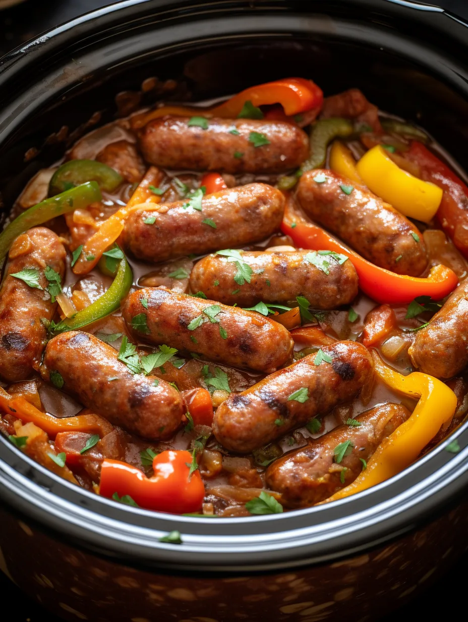 3. Add Ingredients to Slow Cooker: Place sliced bell peppers, onions, and garlic in the slow cooker. If you browned the sausages, cut them into bite-sized pieces and add them to the cooker. If not, add the whole sausages directly.